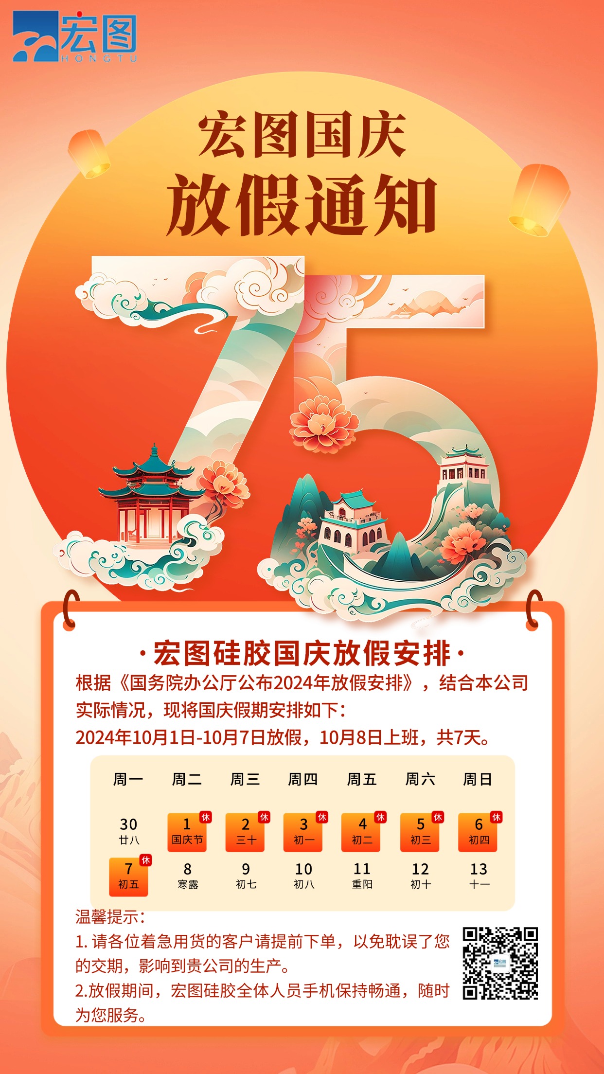 2.放假期間,宏圖硅膠全體人員手機保持暢通,隨時為您服務。